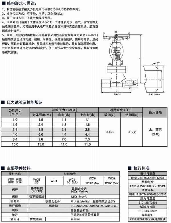 NKJ41H焊接式真空隔離截止閥采用主體鑄鍛結(jié)構(gòu),具有平行雙密封副半強制雙向密封,密封面到位運動和楔形塊楔緊運動分步作用實現(xiàn)零泄漏。真空隔離截止閥適用于公稱壓力PN4.0~10.0Mpa,工作溫度≤200℃的火力電站回水冷凝系統(tǒng)管道上,切斷或接通中的介質(zhì)。適用介質(zhì)為:水、蒸汽等。密封面運動磨擦力小、啟閉輕便,而且密封面磨損有自動補償功能。結(jié)構(gòu)簡單、緊湊、檢修方便,使用壽命長。閥蓋填料室設(shè)有真空密封結(jié)構(gòu),具有自脹壓緊作用,并且密封采用高強膨脹材料密封,使系統(tǒng)與大氣完全隔離,具有很好的系統(tǒng)氣密性。真空隔離截止閥連接形式分法蘭、焊接兩種,驅(qū)動方式有手動、電動兩種。真空隔離截止閥適用于工作溫度≤425℃和≤550℃,工作介質(zhì)為水、蒸汽或空氣的管路上,作為啟閉裝置;真空隔離截止閥尤其適用于火電廠汽機冷凝和真空負(fù)壓系統(tǒng),起真空隔離密封作用。
