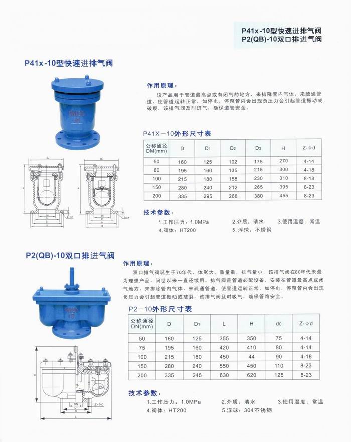 P41X快速進排氣閥:快速排氣閥適用于介質為水的管道上,作為排除管道內氣體的設備,以提高輸水設備的效率和保護管道不致變形、破裂,是管道必備之設備。P41X快速進排氣閥的工作原理:當管內開始注水時,塞頭停留在開啟位置,進行大量排氣,當空氣排完時,閥內積水,浮球被浮起,傳動塞頭至關閉位置,停止大量排氣,當管內水正常輸送時,如有小量空氣聚集在閥內到相當程度,閥內水位下降,浮球隨之下降,此時空氣由小孔排出,當抽水機停止,管內水流空時或遇管內產生負壓時,此時塞頭迅速開啟,吸入空氣,確保管線完全。